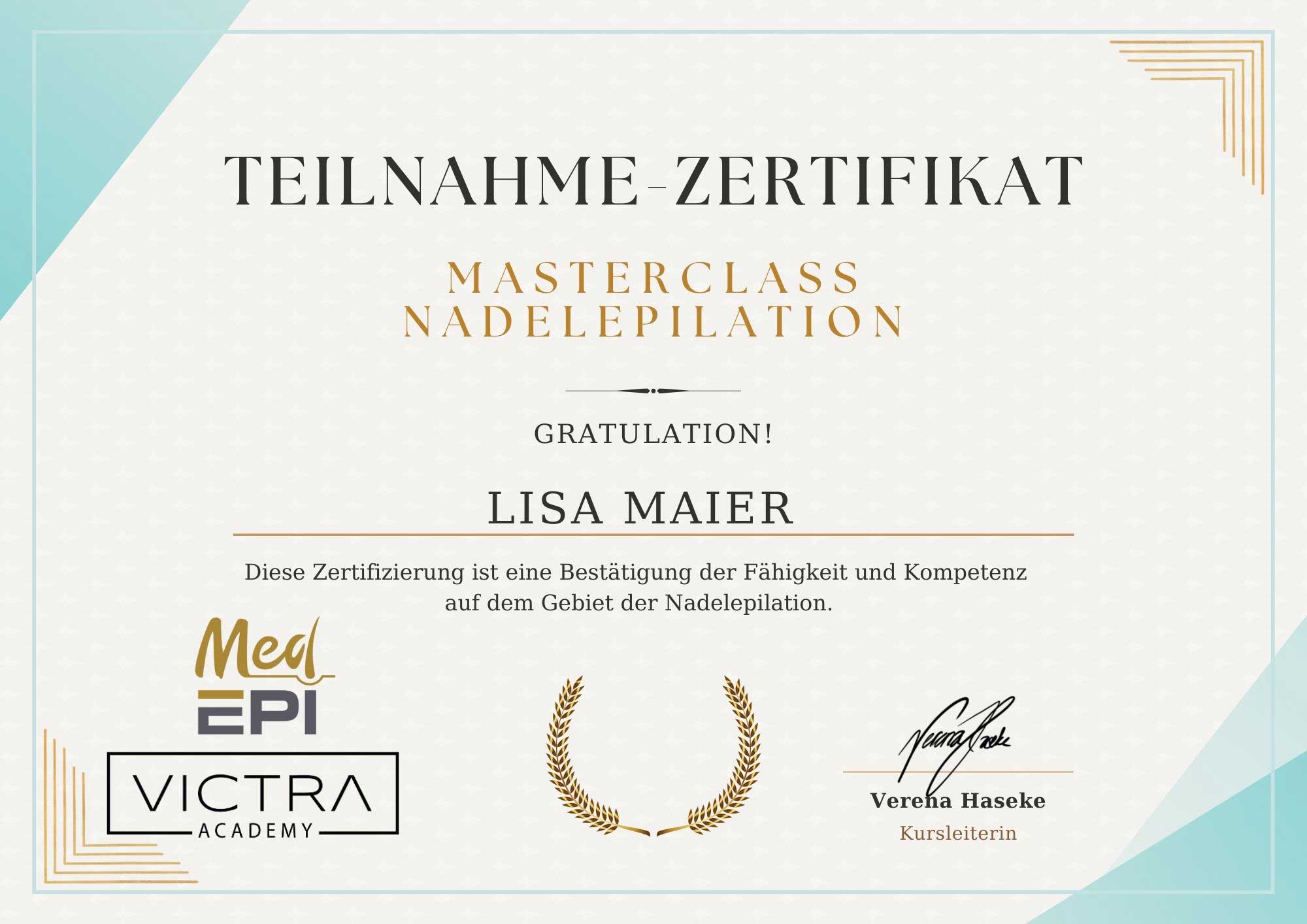 Das Teilnahme-Zertifikat des Nadelepilationskurses ist ein deutliches Zeichen deiner Fähigkeiten und Kenntnisse in dieser speziellen Haarentfernungstechnik. Es bestätigt, dass du mit den neuesten Methoden vertraut bist und sie sicher anwenden kannst.